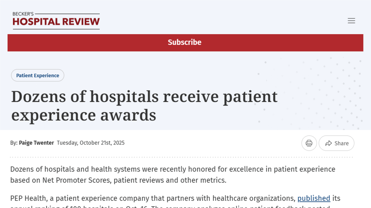 PEP Health's 2026 US Hospital Rankings for Patient Experience have been featured again in Becker’s Hospital Review, highlighting a growing national focus on patient-centered quality. The rankings identify hospitals across the US that delivered consistently exceptional experiences through the eyes of patients and families, by using AI to analyze what they said online across social [...]